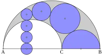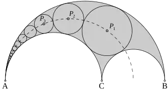 - Geef de van de keten van Pappos deel uitmakende halve cirkel uit de arbelos nummer 0, de ingeschreven cirkel van de arbelos nummer 1, enzovoorts. De opmerkelijke stelling die Pappos formuleerde, is dat een rij van elkaar rakende congruente boven elkaar gerangschikte cirkels, beginnend met cirkel nummer naar beneden, eindigt met een cirkel waarvan het middelpunt op de basislijn AB ligt. Of, anders geformuleerd, dat het middelpunt van deze cirkel met nummer een afstand heeft van tot AB, waar de straal is van cirkel nummer .