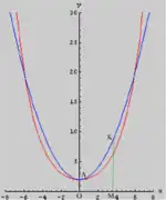 - De lengte van de boog AK tussen het laagste punt A en het punt K met abscis (zie afbeelding) is gelijk aan: