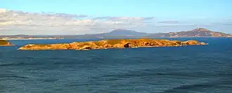 Whalers-strand uitkijkend op Michaelmas-eiland vanop Vancouver-schiereiland -