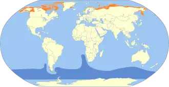 Verspreidingsgebied van de kleinste jager broedgebied (oranje)