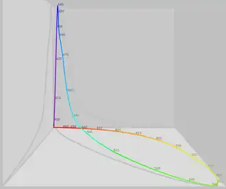 Op de assen (naar rechts, naar voren, naar boven) zijn de genormaliseerde responsies van de kegeltjes (L, M, S) uitgezet. Op elk van de zijvlakken is de kromme loodrecht geprojecteerd als een grijze lijn. Deze drie projecties zijn de spectrumkrommen van de drie verschillende soorten kleurenblindheid: protanopie (linkervlak), deuteranopie (achtervlak) en tritanopie (grondvlak).