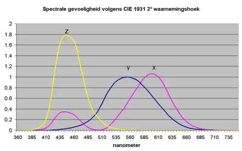 De gevoeligheid van de verschillende kegeltjes is afhankelijk van de golflengte en zelfs van de hoek waarin het object waargenomen wordt.
