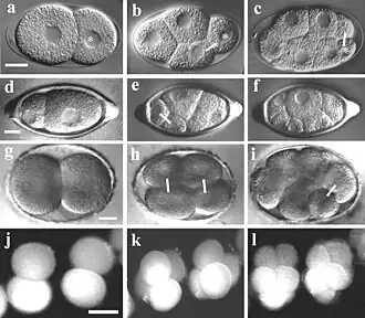 Caenorhabditis elegans heeft een holoblastische isolecithale rotatieklieving. Het ei bestaat uit één cel, met herkenbare volgende stadia van twee cellen, vier cellen en acht cellen. Uiteindelijk is de morula gevormd. Elke asymmetrische klieving produceert een grote blastomeer (macromeer) (AB, MS, E, C, D), die gedifferentieerde nakomelingen en een kleine kiemcelblastomeer (micromeer) (P1-P4) vormt. In de eerste klieving is de klievingsgroef asymmetrisch langs de voor-achteras en dichter bij wat de achterpool zal zijn. Die klieving vormt een voorste en een achterste blastomeer. Tijdens de tweede klieving deelt de voorste blastomeer (AB) zich equatoriaal (longitudinaal, 90 ° ten opzichte van de voorste-achterste as), terwijl de P1-blastomeer zich meridionaal (transversaal) deelt om een ander blastomeer (EMS) en een achterste blastomeer (P2) te produceren. De blastomeerlijn zal zich altijd meridionaal delen om een voorste blastomeer te vormen en een achterste blastomeer die de blastomeerlijn zal voortzetten. De E-blastomeer is het begin van de vorming van de darmen en de P4-blastomeer vormt de kiembaan. Op deze manier bestaat de pas uit het ei gekomen mannelijke L1-larve uit 558 cellen. Sommige cellen blijven zich delen en vormen de 1033 lichaamscellen van de volwassen mannelijke nematode.[13][14][15]
