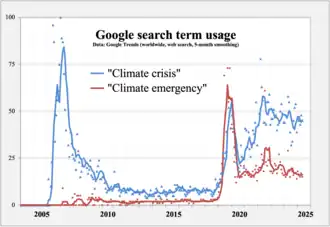 In 2020 schreven meer dan 11 duizend wetenschappers in een verklaring dat "de klimaatcrisis is aangebroken" en "een enorme schaalvergroting van de inspanningen om onze biosfeer te behouden nodig is om onnoemelijk lijden als gevolg van de klimaatcrisis te voorkomen."[5] Een onderzoek liet zien dat de term een sterke emotionele reactie en een gevoel van urgentie oproept,[6] anderen waarschuwen dat de term contraproductief kan werken.[7][8]