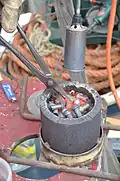 - Een stalen klinknagel of bout met aangevormde klinkkop wordt verhit.