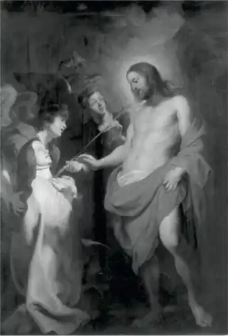 - ↑ In 1940 is het schilderij verbrand tijdens de London Blitz. Kunsthandelaar François Deroy had er in 1758 een (inferieure) gravure van gemaakt met de inscriptie: "Gravé d'après le tableau original qui est dans l’église des R. R. P. P. petittes [sic] Carmes à Bruxelles" (zie fiche op RKD). De "petittes" betekent niet dat het doek was overgebracht naar de Kerk van de Karmelietessen, gelet op de "Révérends Pères". Zie ook Edeltraud Klueting, "Ikonen der Spiritualität des Karmel. Peter Paul Rubens' Darstellungen Teresas von Ávilla und ihre Vorbilder", in: Carmelus, 2013, blz. 47-100. Gearchiveerd op 17 oktober 2017.