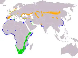 Verspreidingsgebied van de kluut ■ broedgebied (geel)
