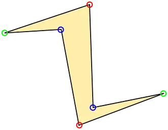 Een toepassing is de samengestelde lijn, die bestaat uit een aantal lijnstukken die op elkaar aansluiten. De uiteinden van de lijnstukken zijn de knooppunten. In de figuur zijn die met gekleurde cirkels aangegeven.