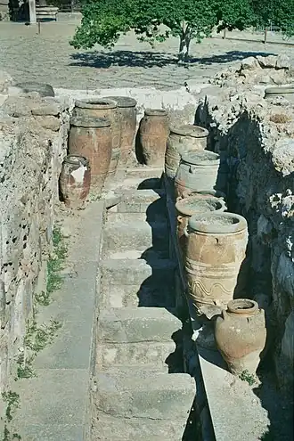 Bij de opgravingen werd de westelijke vleugel van het paleis ontdekt. Men vond er veel aardewerk, vazen en kannen en de beroemde stierenfresco.[2]