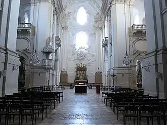 Het schip wordt overwelfd met torenhoge tongewelven in kruisvorm. De zijaltaren in de kapellen zijn gewijd aan de vier faculteitsheiligen: Thomas van Aquino (theologie), Ivo (rechtsgeleerdheid), Lucas (geneeskunde) en Catherina (filosofie). De figuren in de nissen zijn van de hand van Josef Anton Pfaffinger en Meinrad. Het altaarstuk van de linker en de rechter transept werden vervaardigd door Johann Michael Rottmayr (1721-1722).