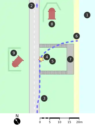 | 1) Vierwoudstrekenmeer 2) Luzernerstrasse 3) Regenafvoeropening 4) Perenboom 5) Gedenkkruis | 6) Rietgordel 7) Bezoekersgebied 8) Nieuwe locatie kapel 9) Oude locatie kapel |