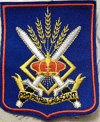 - ↑ Heraldische beschrijving: In azuur met twee schuinsgekruiste zwaarden van zilver, de gevesten van sabel, de punten naar omhoog, vijf korenaren van goud ondersteunend, met de Koninklijke Kroon in hartpunt geplaatst, alles over een uitgebroken ruit van goud. Een band van hetzelfde met de wapenspreuk PRO PATRIA CRESCUNT, in letters van sabel, over de gevesten (VOOR HET VADERLAND GROEIEN)