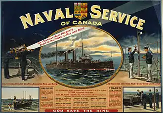 In het begin van de 20e eeuw was het Britse Rijk in een marinewedloop verwikkeld met het Duitse Keizerrijk, wiens marine sterk groeide. Vanuit Londen kwam de vraag om meer bij te dragen, wat tot hevig politiek debat leidde. Uiteindelijk werd de oprichting van een eigen zeemacht verkozen boven geld en manschappen bijdragen aan de Britse marine. In 1910 werd de Marinedienst van Canada opgericht onder voogdij van het toenmalige Ministerie van Zee en Visserij. Op 29 augustus 1911 gaf koning George V toestemming het predicaat koninklijke te gebruiken.