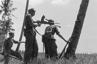 Tussen 1945 en 1949 werd de Koninklijke Landmacht, aanvankelijk vooral bestaand uit oorlogsvrijwilligers (OVW'ers) en later ook uit grote aantallen dienstplichtigen, op grote schaal ingezet tijdens de Politionele Acties.[15] Om in Nederlands-Indië het gezag, de orde en de rust te herstellen werd in 1946 de expeditionaire legermacht Eerste Divisie "7 December" opgericht. In totaal werden tussen 1945 en 1949 zo'n 25.000 oorlogsvrijwilligers en 95.000 dienstplichtigen naar Nederlands-Indië uitgezonden. 4.751 Nederlandse militairen sneuvelden gedurende het conflict.[16]