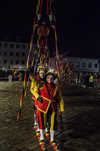 De steltenlopers lopen op stelten die in lengte variëren van 1 meter onder de voet tot maximaal 4,11 meter onder de voet. De hoogste stelten wegen 10 tot 12 kilogram en zijn enkel weggelegd voor de meest ervaren leden, na jaren oefening.[1] De blokkenlopers marcheren per drie in drie paar klompen die op ski's zijn bevestigd. Ze moeten synchroon blijven marcheren, zo niet vallen ze om.