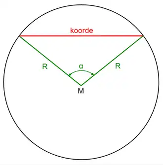 - In een willekeurige cirkel kan de lengte van de koorde worden berekend uit de straal en de middelpuntshoek :