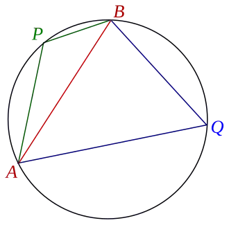 - Een koorde verdeelt de omtrek van de cirkel in twee cirkelbogen en de oppervlakte van de cirkel in twee cirkelsegmenten. Als een punt de ene, en een punt de andere cirkelboog doorloopt dan hebben de hoeken en elk een vaste waarde. Bovendien zijn die twee hoeken supplementair, wat wil zeggen dat hun som 180 graden is. Is de koorde een middellijn, dan zijn volgens de stelling van Thales beide hoeken recht.