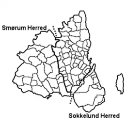 Het amt zonder Roskilde was verdeeld in Sokkelund en Smørum Herred.