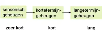 Het seriële geheugenmodel van Atkinson en Shiffrin. Het kortetermijngeheugen heeft een korte duur en beperkte capaciteit. Het krijgt informatie uit het sensorisch geheugen (zeer korte duur maar grote capaciteit) en fungeert als voorportaal naar het langetermijngeheugen (zeer lange duur en grote capaciteit)Een bekende theorie is die van Atkinson en Shiffrin[3] die het kortetermijngeheugen beschouwden als een stadium, of tijdelijke opslagplaats van nieuwe informatie waarop de aandacht is gericht. Als informatie afkomstig van zintuigen maar lang genoeg wordt vastgehouden (bijvoorbeeld door herhaling), vindt automatisch transport plaats naar het langetermijngeheugen. Als dit niet gebeurt vindt er een verval (decay) plaats van de tijdelijk opgeslagen informatie. Er is echter ook bewijs gevonden dat neurologische patiënten met een defect kortetermijngeheugen soms nog wel informatie in het langetermijngeheugen kunnen opslaan (ook het omgekeerde beeld komt voor, zoals bij patiënt HM). Kennelijk is opslag in het voorportaal van het kortetermijngeheugen, zoals omschreven door Atkinson en Shiffrin, niet altijd vereist om informatie in het langetermijngeheugen op te slaan. De neuropsychologie heeft echter wél aannemelijk gemaakt dat aan de processen van het kortetermijn- en langetermijngeheugen verschillende mechanismen in de hersenen ten grondslag liggen.