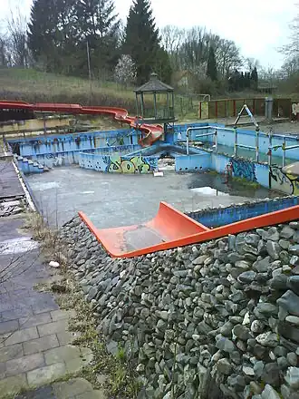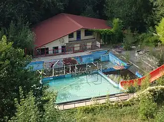 Het zwembad is volledig verdwenen en vormt nu een aardevlakte op de bergflank.