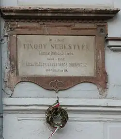 Oude woning (nummer 34) met een gedenkplaat voor Sebastián Tinódy.