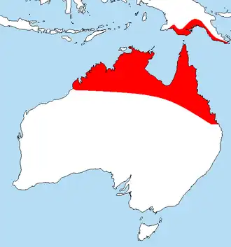 De kraaghagedis komt voor in zuidelijk Nieuw-Guinea en noordelijk Australië, en alleen in kuststreken. In Australië komt de hagedis alleen voor in de noordoostelijke kuststrook, in de staten Noordelijk Territorium, Queensland en West-Australië. De verspreiding loopt westelijk van Broome tot Rockhampton in het oosten. In Nieuw Guinea komt de agame alleen voor in een smalle strook van het zuiden van het eiland. De soort ontbreekt op het uiterst westelijk gelegen eiland Yos Sudarso, maar komt verder in het gehele zuiden van Nieuw-Guinea voor.
