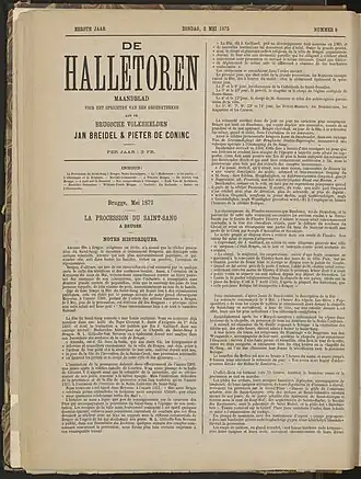 Voorpagina van de Halletoren van 2 mei 1875. Krant bewaard in en gedigitaliseerd door Openbare Bibliotheek Brugge.[2]Aankondigingsblad, advertentieblad (1895-1908).
