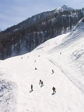 Krasnaja Poljana is een skioord gericht op alpineskiën en snowboarden en is als zodanig een van de meest gerespecteerde skioorden in Rusland.[1][2] Door de hoge luchtvochtigheid ligt er vaak veel sneeuw (poedersneeuw) op de berghellingen rond de plaats. Populaire wintersportvormen zijn freeride en heliskiën (ontstaan in de jaren 90). Er bevindt zich ongeveer 12 kilometer aan gemarkeerde skipistes.