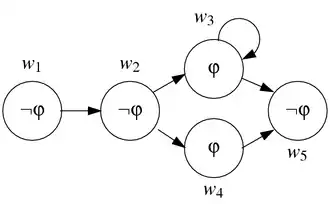Het weergegeven Kripkemodel kan worden gedefinieerd als: