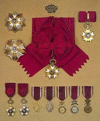 Onderste rij, van links naar rechts: Kruis Officier, Kruis Ridder, Gouden Palmen, Zilveren Palmen, Gouden Medaille, Zilveren Medaille, Bronzen Medaille
