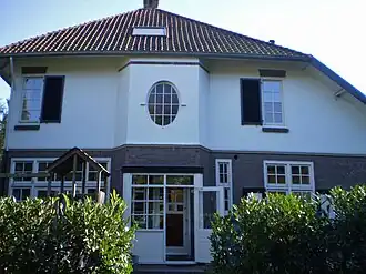 De verdieping van het pand is bepleisterd, aan de voorgevel is een uitbouw met ingang. Boven de ingang is een ovaal venster.