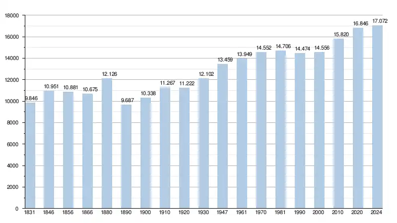 - Bronnen:NIS, Opm:1831 tot en met 1981=volkstellingen; 1990 en later= inwonertal op 1 januari