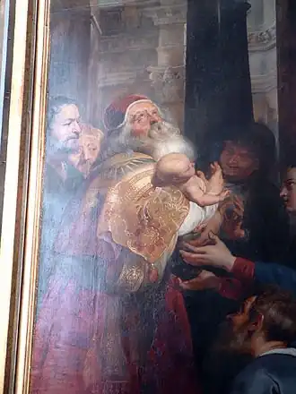 Alle afgebeelde thema's op de voor- en achterkant van het werk hebben iets te maken met "het dragen van Christus". Op de achterzijde bevindt zich links de heilige Christoffel, Χριστόφορος, "drager van Christus" in het Grieks. Links op de voorzijde de Visitatie met de moeder die het kind draagt; rechts de profeet Simeon met de opdracht in de tempel; op het grote middenpaneel onder meer Nicodemus die het dode lichaam van Christus van het kruis helpt dragen. Daarnaast bevat het schilderij nog een tweede thema. Dit wordt ingeluid door Simeon, die de ogen heeft opgeslagen en duidelijk iets zegt. Hij heft een lofzang aan waarin hij het kind omschrijft als "een licht dat voor de heidenen straalt" (Lc. 2:32). Dat Jezus Christus het Licht van de wereld is, wordt ook benadrukt in het middenpaneel. Het is volledig donker en toch is er licht. De lichtbron is het dode lichaam van Jezus, dat de omgeving belicht.[1] Dit verklaart de vreemde schaduw op het gelaat van Johannes: hij staat in tegenlicht. Het zijn Jezus' vrienden die het dode bleke lichaam van het kruis hebben losgemaakt, hem voorzichtig laten zakken en in een lijkwade hullen. Het is nacht en alles is stil. Vier mannen staan op vier ladders: twee over de dwarsbalk gebogen en dan halverwege, twee ter weerszijden. Onderaan, met een voet al op de grond, staat de jonge evangelist Johannes om het achterovervallende zware lijk op te vangen, de spieren van zijn linkerbeen staan strak gespannen. Johannes is gekleed in een stralend rood gewaad. Via de straling van dat warme rood worden we beter gewaar hoe vaag het licht in dit schilderij verder is en hoe omfloerst de sfeer. Door de koele belichting ontstaat een haast sculpturaal effect. Links tegenover Johannes probeert Maria haar zoon aan te raken; linksonder zien wij, geknield, de andere Maria en Maria Magdalena, die een der benen vasthoudt. Opvallend is dat eigenlijk geen van die figuren de dode stevig vastpakt. Wel zijn ze allen in de mooiste houding neergezet, elke houding een briljant soort ornament. Misschien konden zij daardoor het lijk maar licht beroeren: om hun schoonheid niet te veel te compromitteren. In de keuze tussen het vertonen van fysieke inspanning of demonstratieve schoonheid, had Rubens voor het laatste gekozen. Alle figuren op dit middenpaneel zijn gekleed. Daar wordt de schoonheid, de bellezza die hij in Italië had geleerd, uitgedrukt door opulent geplooide gewaden in rijke kleuren – en in de bevallige houdingen waarmee ze gedragen werden. De naakte Christus ziet eruit als een bleek vedergewicht zoals hij daar hangt, wonderlijk mooi, omgeven door een kleurrijke krans van figuren.