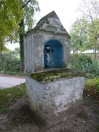 De niskapel zelf is optrokken in Limburgse mergel en is wit geschilderd. De kapel bestaat uit een basement op vierkant plattegrond, daarop bevindt zich een halfronde nis en daarboven een zadeldak. Tegen het gewelf van de nis heeft men een schelpvorm geplaatst. De nis inclusief de schelpvorm is blauw geschilderd en in de nis is tegen de achterwand een zwart kruis geplaatst met daarop een witte corpus van gietijzer.[1][2]