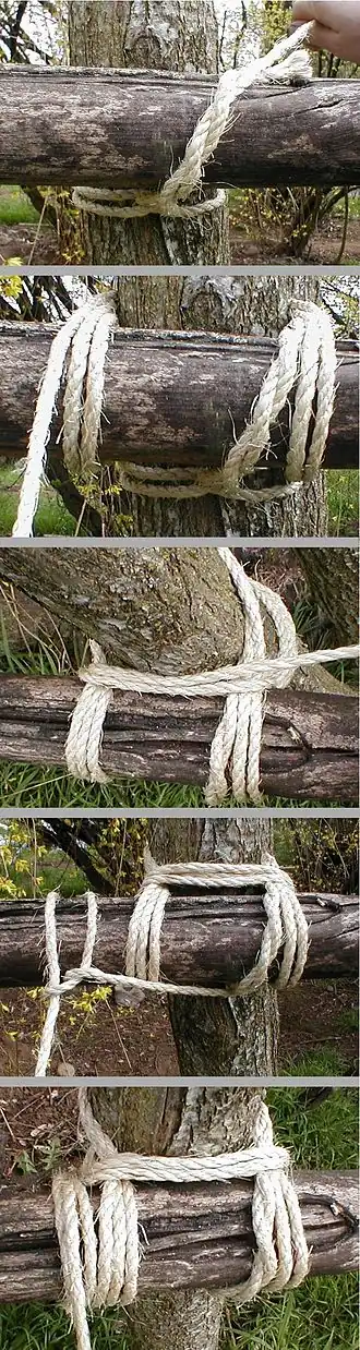 - Na een 3-tal wikkelingen (afhankelijk van de lengte van het touw), leg je een aantal woelingen. Hierbij wordt het touw enkele malen tussen de 2 palen gedraaid, om de eerste wikkelingen. Aangezien dit in hoge mate de stevigheid bepaalt, dienen deze woelingen sterk aangespannen te worden.
