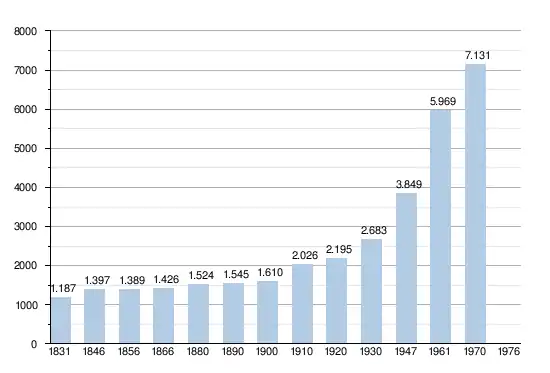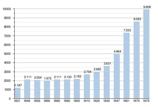 - Bronnen:NIS, Opm:1831 tot en met 1970=volkstellingen; 1976 = inwoneraantal op 31 december