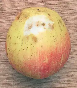 Kurkstip komt vooral voor op de bovenkant, rondom de neus, van de appel.