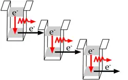 Om het watervaleffect van de kwantumcascadelaser te verkrijgen, moet ervoor gezorgd worden dat de opstelling van de halfgeleiderlagen kwantumputten creëert, die meerdere gekwantiseerde energieniveaus hebben, zoals beschreven in de vorige alinea. Door een spanning aan te leggen worden die gekwantiseerde energieniveaus van aangrenzende kwantumputten zo ten opzichte van elkaar gepositioneerd dat een elektron door kwantummechanisch tunnelen van een laag energieniveau van de ene kwantumput zich een weg kan boren naar een hoog energieniveau van een naburige kwantumput (zie figuur). Vanuit dat hoge niveau 'valt' dat elektron naar het lage niveau van de put en dat energieverschil uit zich in de vorm van het afgeven van een foton. Dit elektron kan opnieuw tunnelen naar een volgende kwantumput en zo een 'cascade' van energievallen veroorzaken doorheen het halfgeleidermateriaal.
