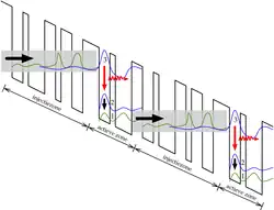 Een typische structuur van een kwantumcascadelaser staat afgebeeld in de figuur. Deze structuur is zo opgebouwd dat het cascade-effect bekomen wordt. De op en neer zigzaggende zwarte lijn op de figuur zijn de kwantumputten. De opbouw is periodiek en bevat afwisselend een injectiezone en een actieve zone (ook wel emissiezone genoemd). Een typische kwantumcascadelaser kan 25 tot 75 periodes bevatten. In de actieve zone 'valt' het elektron in een van haar kwantumputten van niveau 3 naar niveau 2 waarbij het een foton (zigzagpijl) uitzendt. De overgang van niveau 2 naar 1 gebeurt zonder fotonemissie. In de injectiezone, die als een soort tijdelijke opslag van elektronen dient, worden de elektronen doorgetunneld naar de volgende active zone. De populatie-inversie tussen niveau 2 en 3 komt doordat de doorgetunnelde elektronen in niveau 3 gemiddeld 2,1 ps nodig hebben vooraleer ze naar niveau 2 gaan, terwijl elektronen in gemiddeld 0,3 ps verspringen van niveau 2 naar 1.