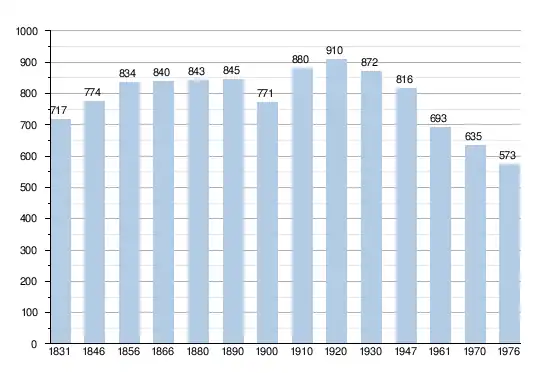 - Bronnen:NIS, Opm:1831 tot en met 1970=volkstellingenmber, 1976= inwoneraantal op 31 december