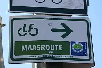 - De route is onderdeel van de EuroVelo EV19 Maasfietsroute, de bewegwijzering wordt in België en Frankrijk doorgezet richting de bron van de rivier.