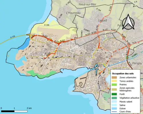 De onderstaande kaart toont de ligging van La Rochelle met de belangrijkste infrastructuur en aangrenzende gemeenten.
