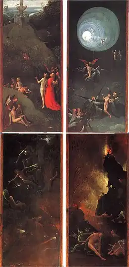 De hel op het rechterpaneel is voorgesteld als een ommuurde vesting met een grote toegangspoort. Vanwege de tegenstelling tussen het linkerluik (Paradijs) en het rechterluik, kan men het rechterluik opvatten als de hel. Soldaatachtige monsters proberen een bres in de vestingmuur te slaan. Vlak voor de poort is te zien hoe een verdoemde ziel, die aan zijn helm te herkennen is als soldaat, rijdend op een os, een plateau voortbeweegt met daarop een ketel waarin zich een non en een monnik bevinden.