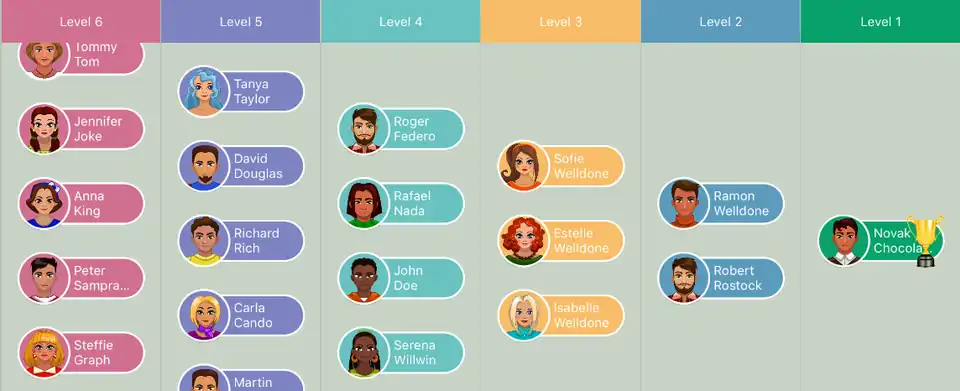 Een speler mag alleen andere spelers uitdagen die boven hem staan, maar maximaal één niveau hoger. Op niveau 1, het hoogste niveau, staat één speler. Daaronder, op niveau 2 staan twee spelers, op niveau 3 staan drie spelers en zo verder. Op de plaatjes hieronder heeft ieder niveau een andere kleur.