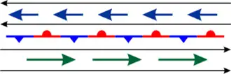 Ontstaansfase; in een stationair front vormt zich een golf. -