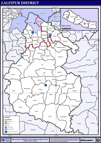 - Dorpscommissies (41): Ashrang, Badikhel, Bhardev, Bhattedanda, Bisankhunarayan, Bukhel, Bungmati, Chandanpur, Chapagaun, Chhampi, Choughare, Dalchoki, Devichour, Dhapakhel, Dhusel, Dukuchhap, Gimdi, Godamchaur, Godawari , Gotikhel, Harisiddi (of: Harisiddhi), Ikudol, Imadol, Jharuwarsi, Kaleswor, Khokana, Lamatar, Lele, Lubhu, Malta, Manikhel, Nallu, Pyutar, Sainbu, Sankhu, Siddhipur, Sunakoti (of: Sunakothi), Thaiba, Thecho, Thuladurlung, Tikathali.