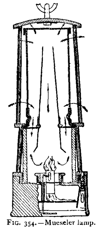De werking is gebaseerd op de lamp van Clanny. De verbrandingsgassen gaan naar boven via een soort schoorsteen en bedekken daarbij het bovenste gaas. Boven het glas is er een diafragma uit een soort gaas waarlangs de zuurstof binnen kan tot aan de vlam. De vlam is helderder dan de voorgaande lampen omdat het metaalgaas niet voor de vlammen hangt. De verbrandingsgassen die een laag vormen rond de vlam ondersteunen de verbranding niet en zetten een eventuele explosie niet verder. Hierdoor gaat de lamp uit als ze blootgesteld wordt aan een explosief luchtmengsel.