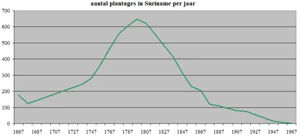 De tweede helft van de 18e eeuw kenmerkte zich door een overmatige steun van de plantages met kredieten uit Nederland en een naar verhouding te luxueus leven op de plantages in Suriname. Hierop volgde in 1773 een beurskrach wat tot het faillissement van veel plantages in Suriname leidde. Sinds 1800 was er een aanhoudende teruggang in het aantal plantages totdat ze rond het midden van de 20e eeuw geheel verdwenen.[5]
