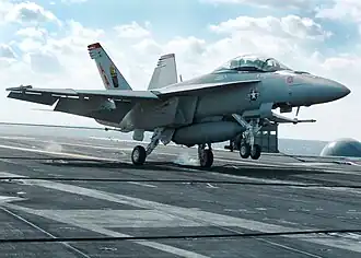 Om te landen op een vliegdekschip zijn de vliegtuigen uitgerust met haken aan de staart van het toestel. Daarmee wordt een van de meestal vier kabels gegrepen die over het dek gespannen zijn. Deze zijn verbonden met hydraulische pompen die ervoor zorgen dat het vliegtuig binnen de 100 m wordt afgeremd tot stilstand. Om de landing te vergemakkelijken vaart het schip tegen de wind in en landen de toestellen met de vaarrichting mee om de relatieve snelheid van het vliegtuig t.o.v. het schip zo laag mogelijk te maken, en om zo min mogelijk last te hebben van zijwind. Om weer te kunnen opstijgen, mocht de landingshaak gemist worden, wordt er geland met de motoren op volle kracht.