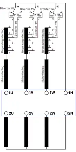 In serie met de wikkeling staat een regelwikkeling die meerdere aftakkingen heeft. De regelwikkeling kan dus volledig maar ook slechts gedeeltelijk ingeschakeld worden. Alle afleidingen van de regelwikkeling worden aangesloten op de selector. De regelwikkeling heeft een bereik van ca. 10 procent van de spanning. Het hoofdaandeel van de spanning wordt dus geleverd door de hoofdwikkeling; in nevenstaande figuur staat de lastschakelaar in de hoogspanningswikkeling en is het dus de hoogspanningswikkeling die een regelwikkeling heeft. In principe kunnen we de spanning van de primaire niet regelen; het is voor step-down distributietransformatoren immers de voedende spanning. Dat heeft ook geen belang want een lastschakelaar regelt strikt genomen enkel de overzetverhouding van de transformator en kan dus zowel aan de laagspanningszijde als aan de hoogspanningszijde geplaatst worden. Overeenkomstig moet dan ook de regelwikkeling in de laagspanningszijde of in de hoogspanningszijde geplaatst worden.